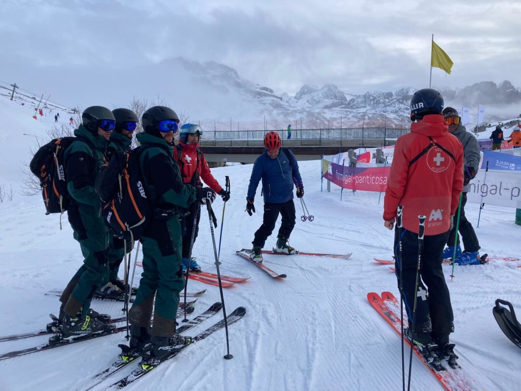 La práctica de primeros auxilios la realizaron con el equipo de pisters de la estación Aramón Formigal-Panticosa. Se trataba de una de las prácticas finales de la formación que reciben estos futuros guardias de montaña en materia de Primeros auxilios.