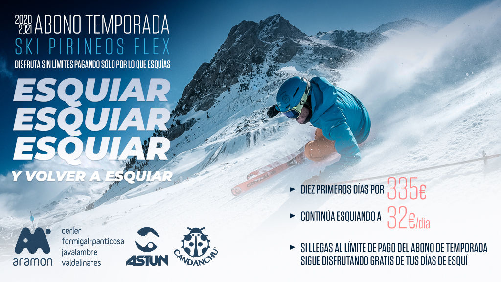 Con estas características, el abono SKI PIRINEOS FLEX se convierte en un producto perfecto que se adapta a las circunstancias y al ritmo de cada usuario. Además, desde Aramón, Candanchú y Astún hemos apostado porque los diez días adquiridos en prepago sean válidos para dos temporadas de esquí, permitiendo de esta forma adaptarnos mejor a las necesidades vosotros, de nuestros esquiadores, y de los temores de que por las restricciones no pudierais hacer uso de los mismos